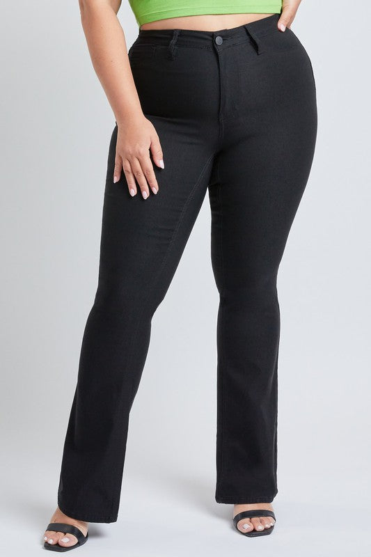 Junior's Plus Size Basic High-Rise Flare features high-waist, extreme stretch, faux pockets on front with functional pockets in back, single-button closure with front zip, and belt loops.